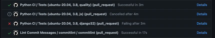 When you submit a pull request (PR) to an Open edX repository, a series of tests - which vary from repo to repo - are run. Sometimes tests won’t be run at all, and sometimes they’ll fail or be canceled. That looks like this: