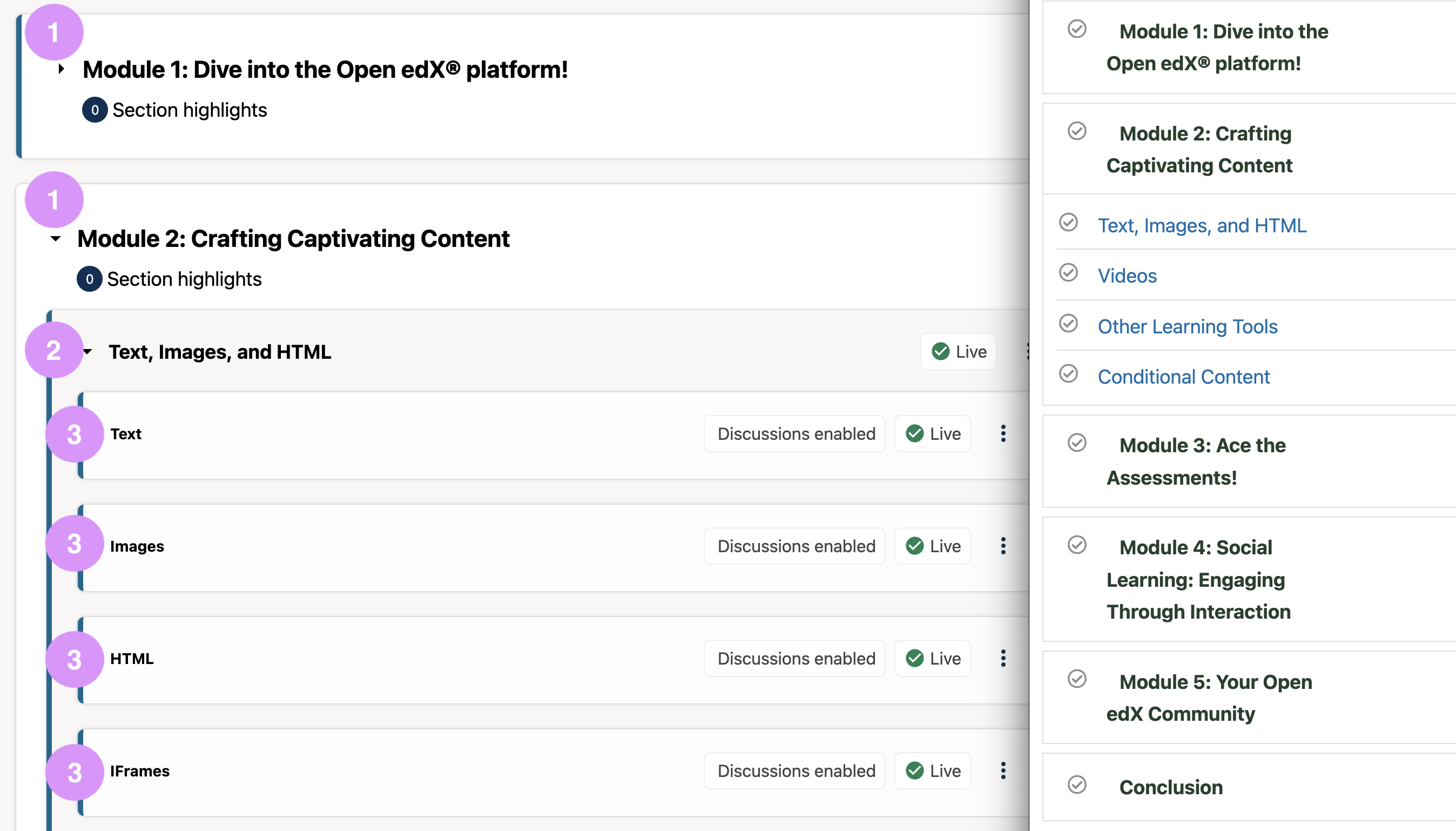 In the following image, the Studio view of the course outline is on the left. On the right is the view of the course outline in the LMS.
