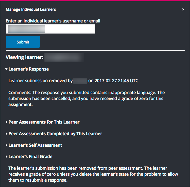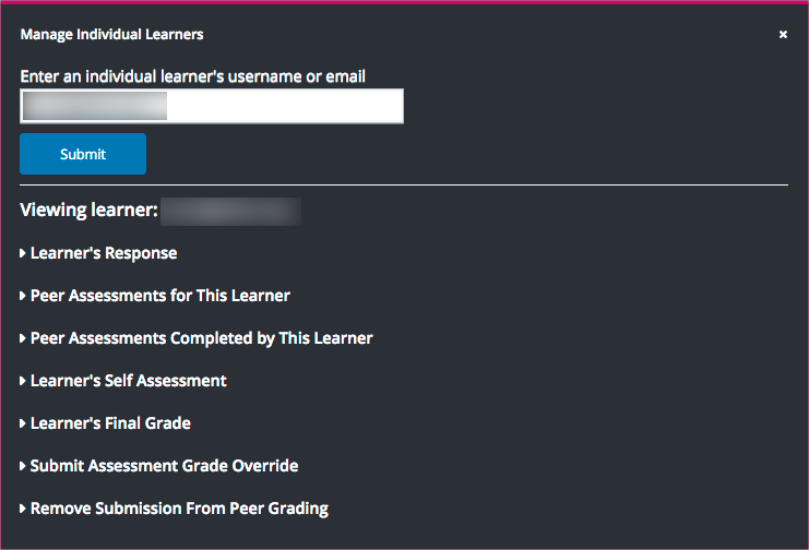 For more details about accessing information for a specific learner, and for an example that shows a learner’s response with peer assessments, see Access a Specific Learner’s Information.
