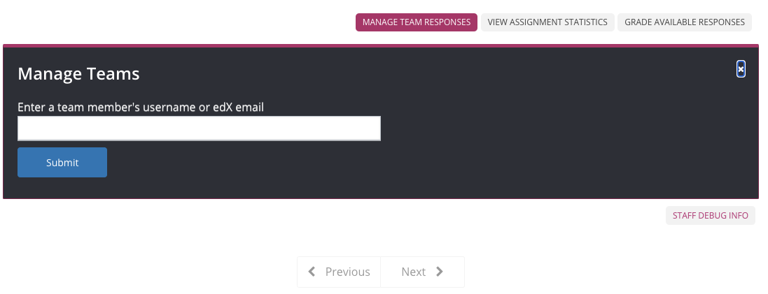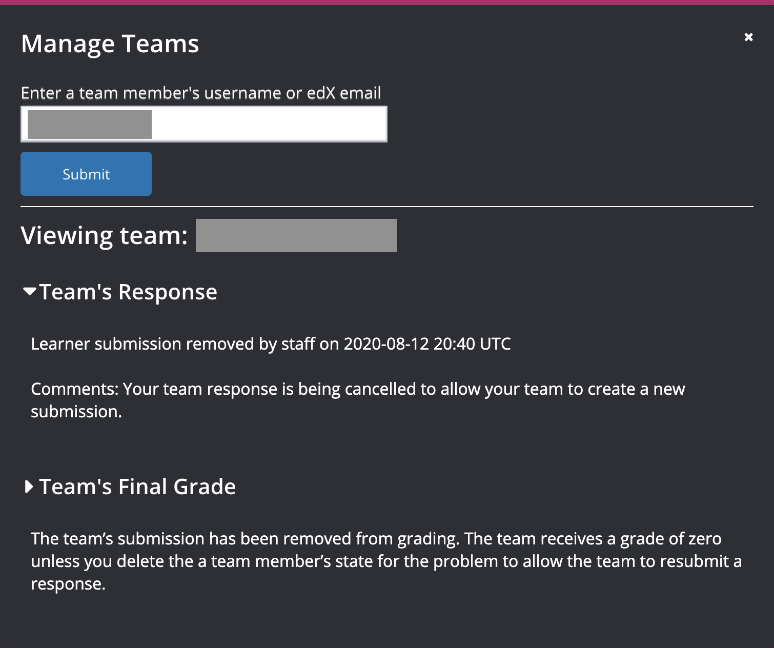 Optionally, delete the team’s state for the problem. This allows the team to submit another response. For more information, see Delete a Learner’s State for a Problem. If you follow the instructions on that page and enter the username of a student on a team, the team state will be cleared.