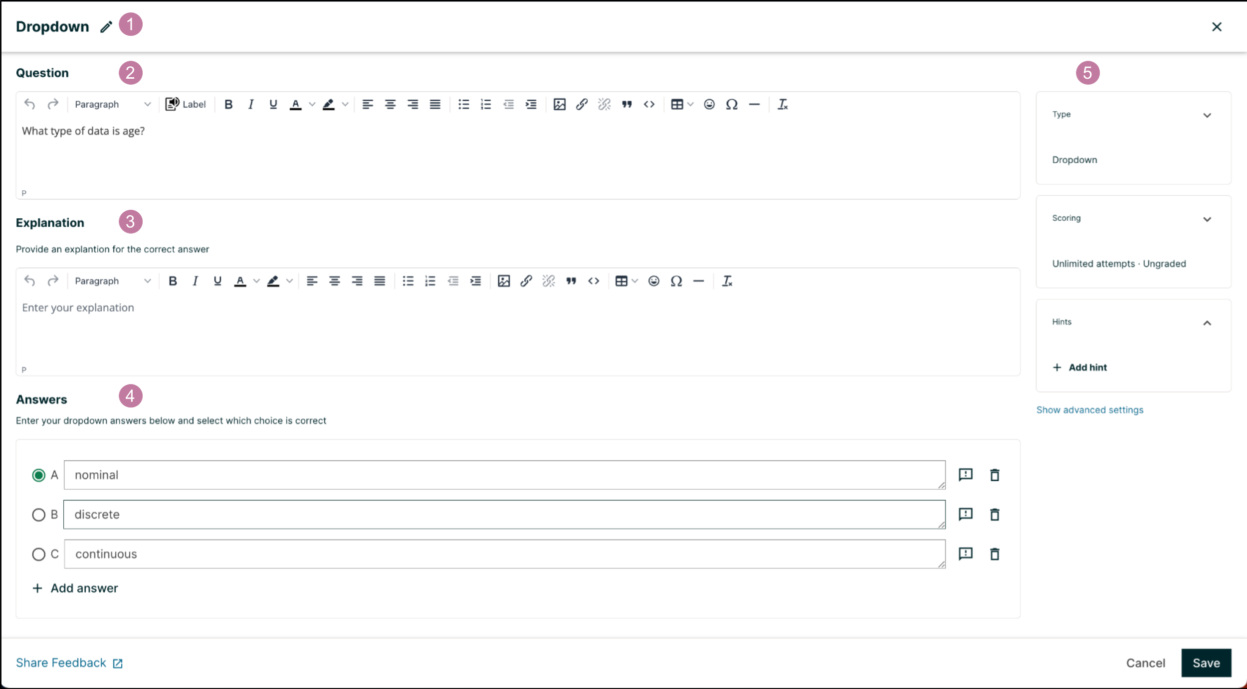 An example dropdown problem in the problem editor with number indicators labeling the various features.