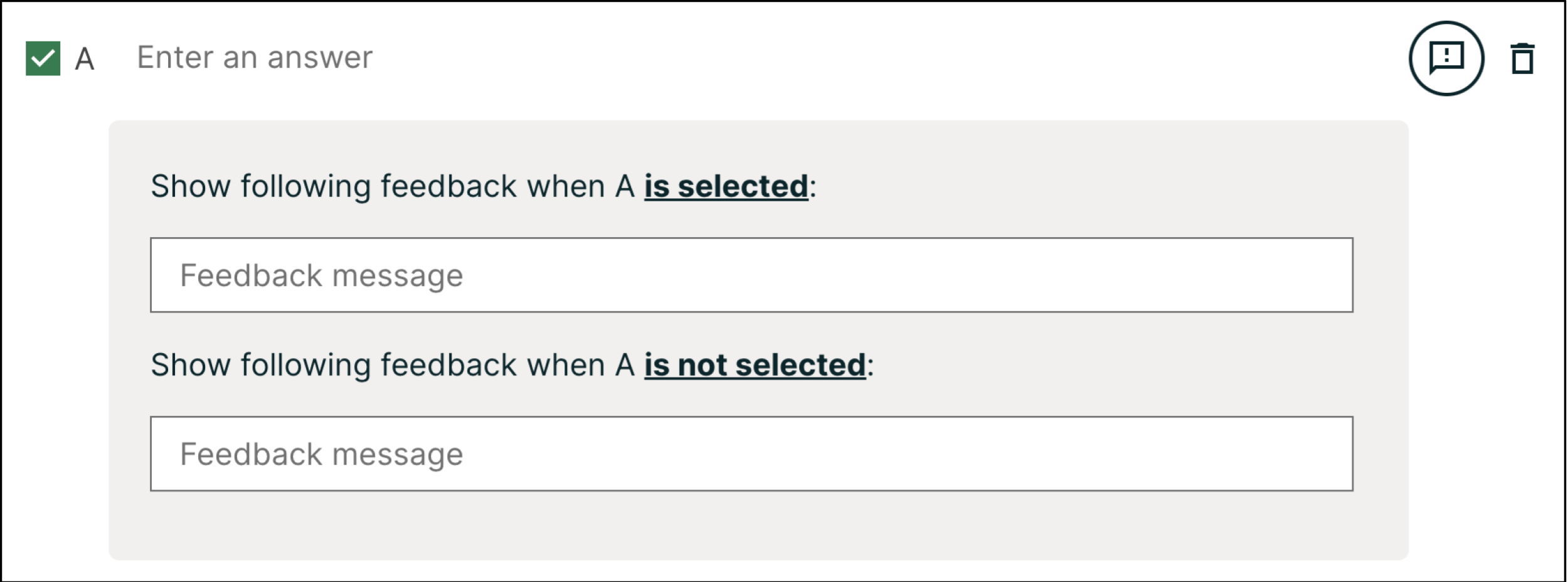 Filling in the Answer fields. Select the correct answer(s) by ticking off the checkbox(es). Additional answers can be added by clicking the Add answer button. Answers can be deleted by clicking the trash can icon. Feedback can be provided for each answer. More information on feedback can be found in the following section.