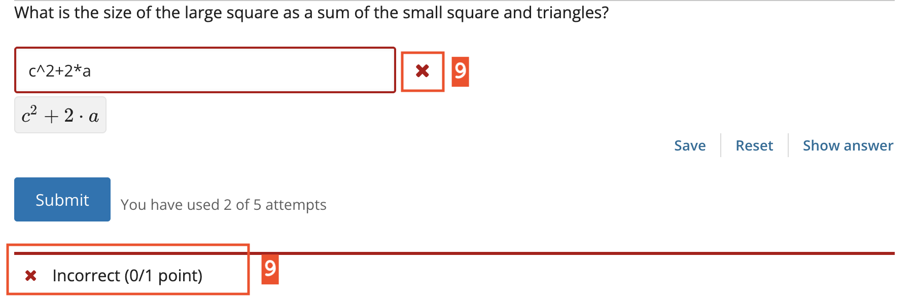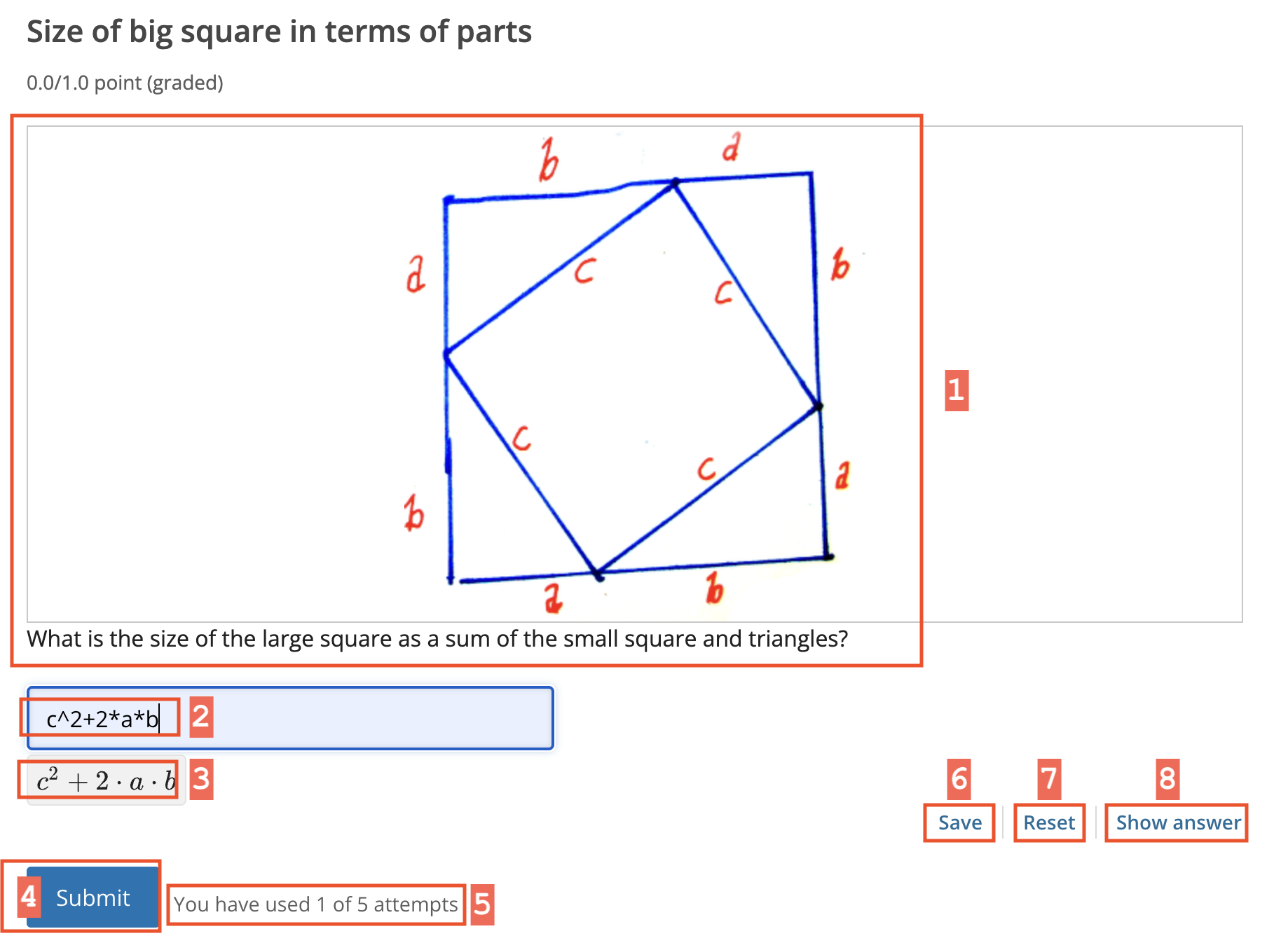 Rendered answer. For some problem types, the LMS uses MathJax to render plain text as “beautiful math.”