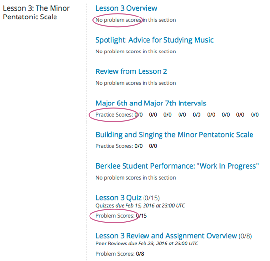 For each problem in a graded assignment, the points that you earned out of the possible points is shown with the label Problem Scores. Scores for ungraded problems are shown with the label Practice Scores. Sections that do not have any problems are labelled as having no problem scores.
